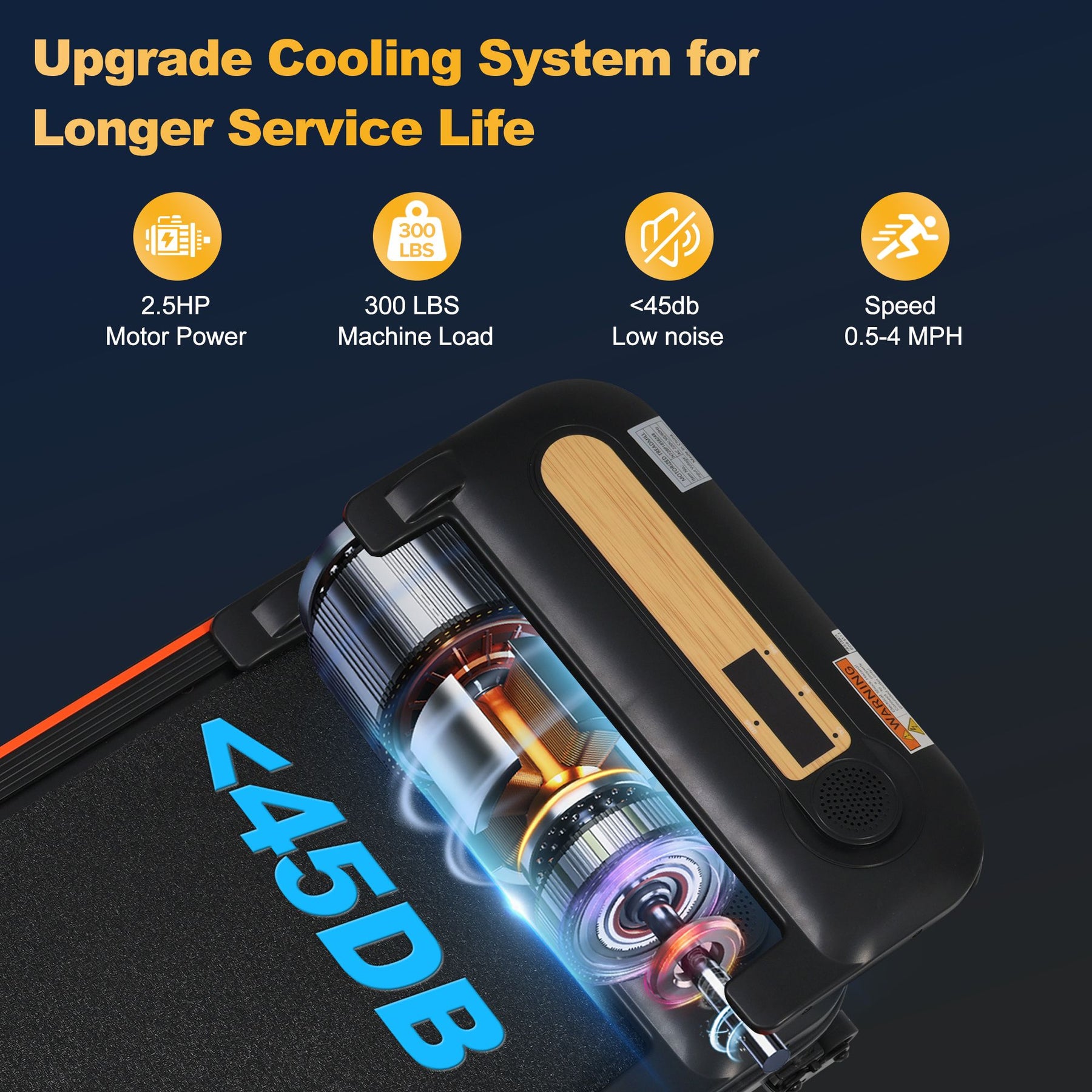 About this item0.5-4MPH -- The walking treadmill with a powerful 2.5 HP motor provides a large carrying capacity of up to 300 pounds. This under desk treadmill provides a speed of 0.5 - 4MPH, which is adequate for most trainees. The right home treadmill can help you integrate fitness into your daily life, and enjoy exercise in the comfort of your home regardless of the weather.NO INSTALLATION -- No need to install, just take this walking pad out and use it. The dimension of the electric treadmill is 44.48"*19.09"*3.93". With transport wheels, you can easily move and store it under a sofa, bed, or behind a door, which greatly frees up some floor space.FITNESS TRACKING DISPLAY -- Our portable Treadmill is designed with a LED display to show speed, distance, time, and calories burned, allowing you to visualize your exercise and maintain motivation. You can control the speed or stop the treadmill by pressing the remote control.PROTECT YOUR KNEES -- 5 layer anti-slip belt of this desk treadmill is designed to absorb the force of your step, to protect your joints and ligaments from damage.NEW DESIGN WITH INCLINE--New Treadmill With One Second Incline Adjustment. Burn fat more effectively